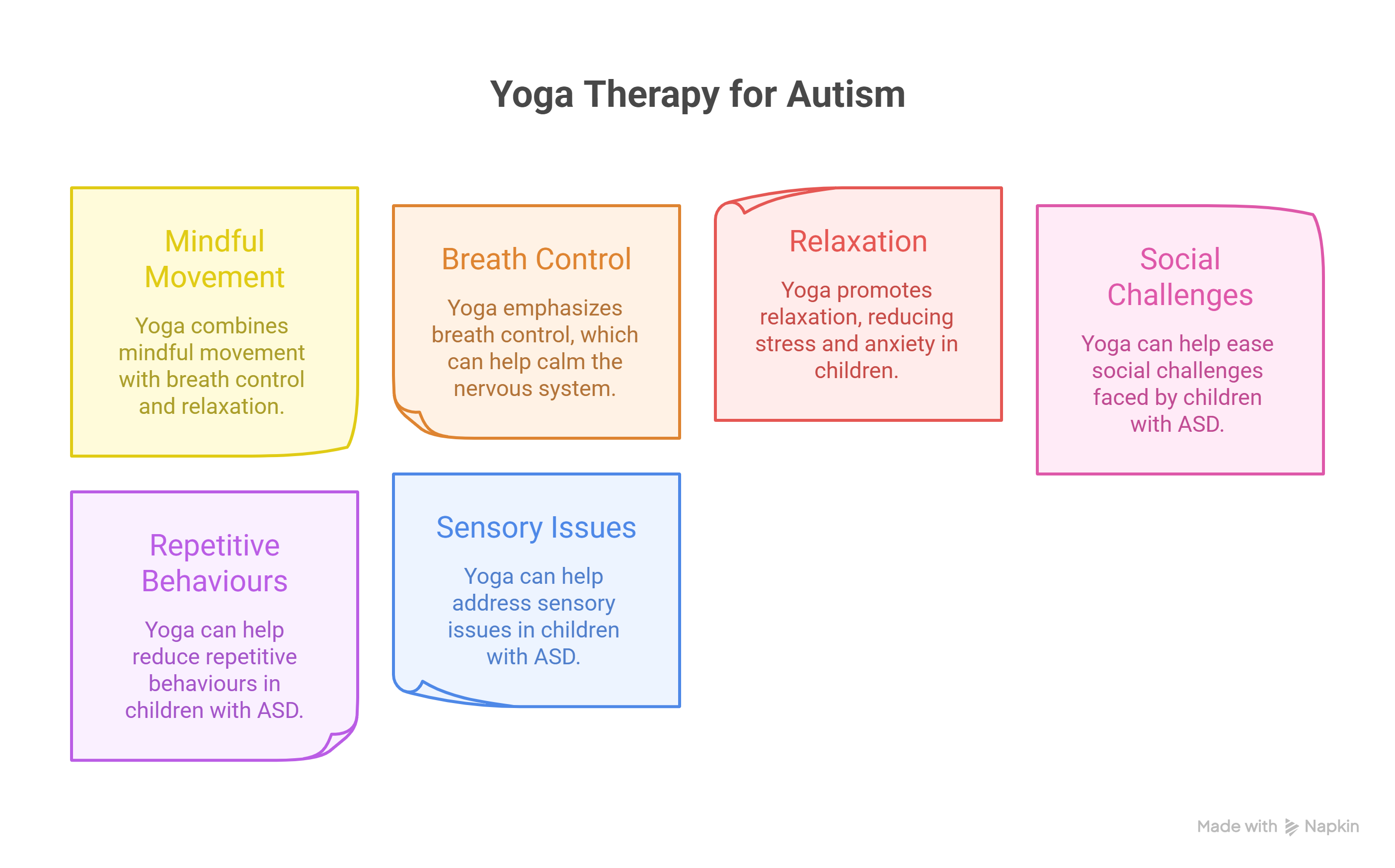 Yoga addresses ASD’s triad—social deficits, communication barriers, and repetitive patterns—through neuroplasticity. Mindful poses build proprioception and bilateral coordination, while Breathing Exercises for Kids with Autism calm hyperactivity via vagus nerve stimulation. Kids Yoga for Concentration and Memory further aids focus, as seen in pose sequences improving recall and attention.