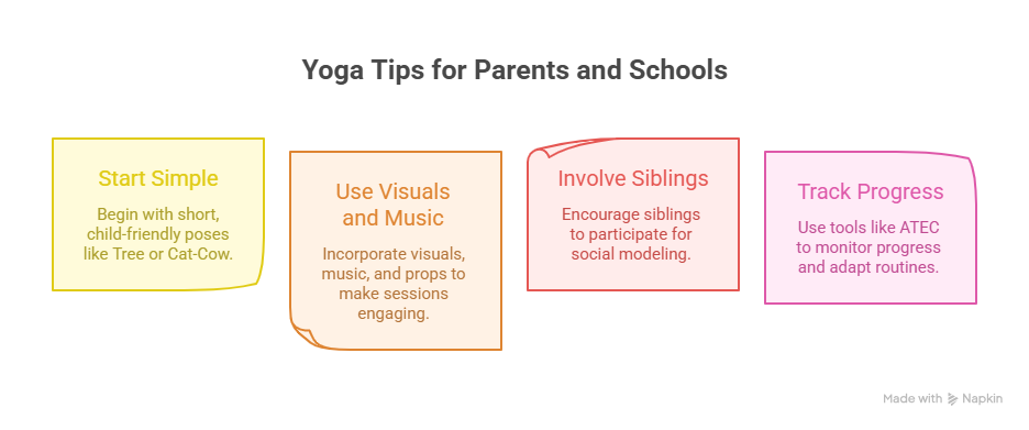 Start simple: 10-15 minutes daily with child-friendly poses like Tree (for balance) or Cat-Cow (for spine awareness) as part of Kids Yoga for Concentration and Memory. Use visuals, music, and props; involve siblings for social modelling during Yoga Therapy for Special Needs Children sessions. Track progress with tools like ATEC, and adapt Therapeutic Yoga for Autism Children routines to individual needs for best results.